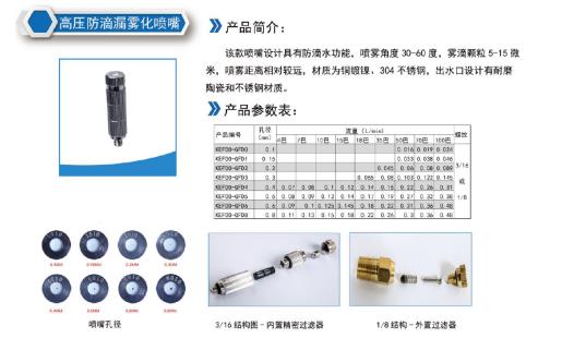 噴嘴選用:選用導(dǎo)流片式噴嘴,內(nèi)置精密過(guò)濾器,噴霧霧滴細(xì)小5-15um,工作壓力40-80公斤,流量60ml/min